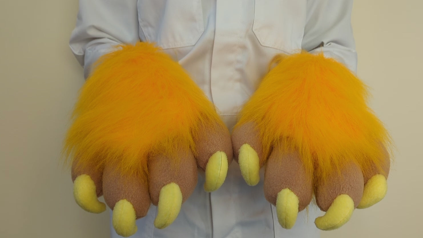 These fursuit hand paws are handcrafted from fleece and medium-quality fur, with a cheerful inner lining.