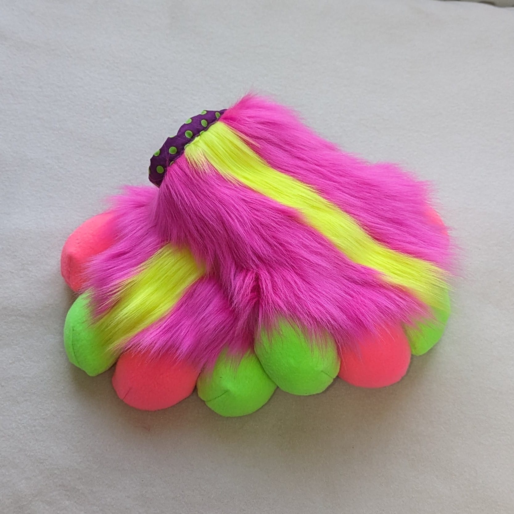 These fursuit handpaws are handcrafted from fleece and high-quality fur, with inner lining and Blacklight reactive!!
